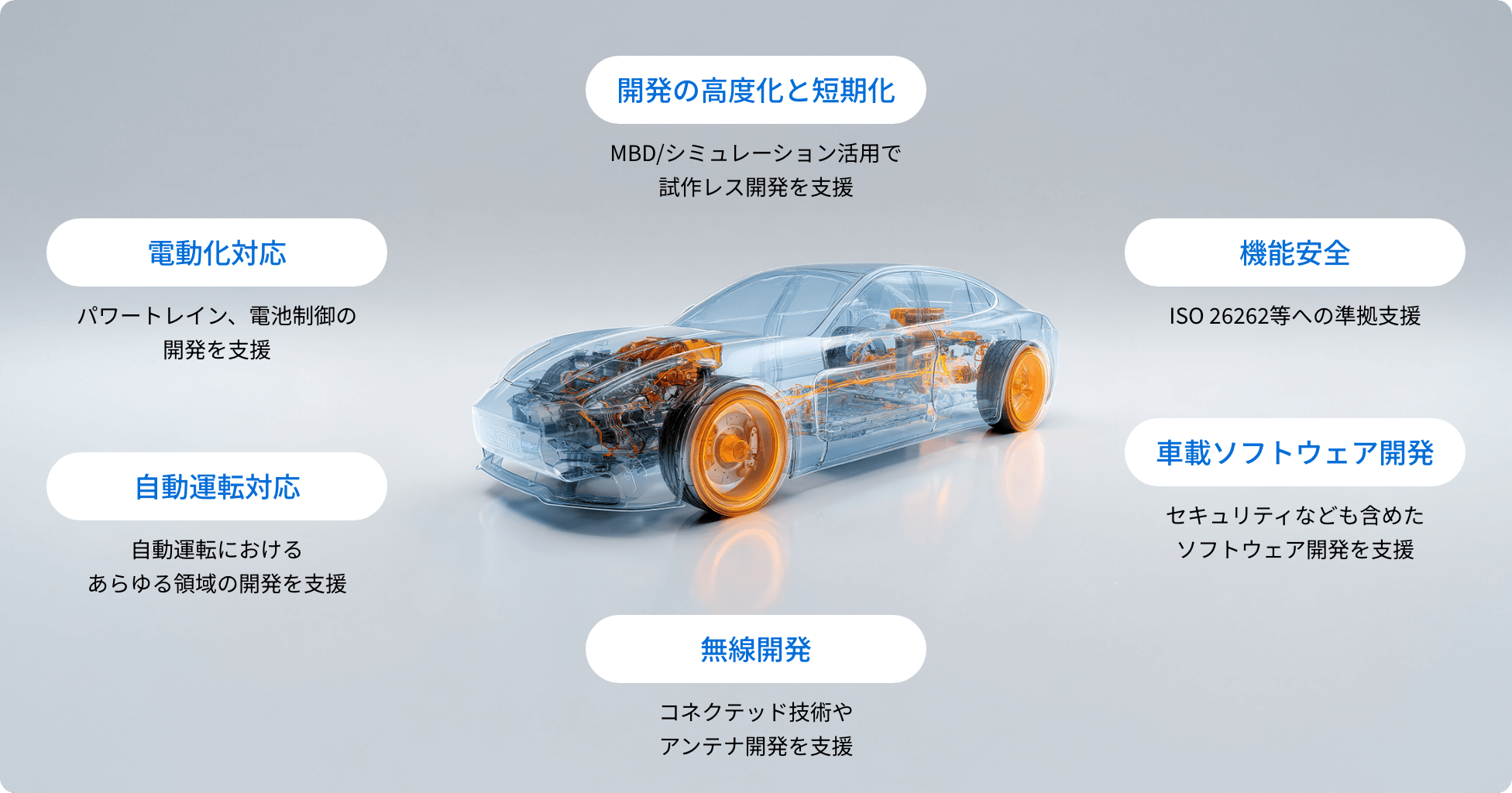 試作レス時代への対応や開発期間の短縮、車載システムの複雑化など、自動車の開発現場は高度化と短期化が進んでいます。弊社ではMBDとシミュレーションにより、より複雑な事象を、より正確に検証。試作レスや開発期間の短期化に貢献します。