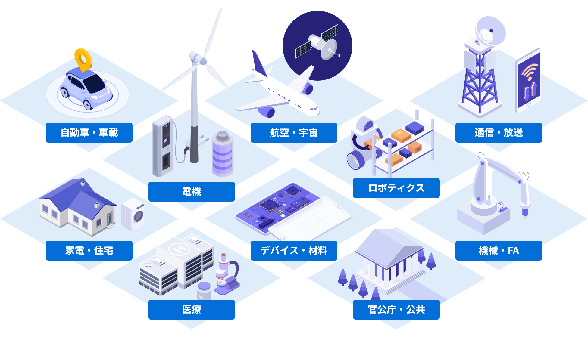 アンテナ・無線、パワエレ・エネマネ、画像・センシング、スマートデバイスといったコア技術に加えAI、クラウドなど多岐にわたる最先端の技術領域をカバー。複雑な課題にも、保有技術を掛け合わせることで幅広い技術領域での支援を可能にしています。