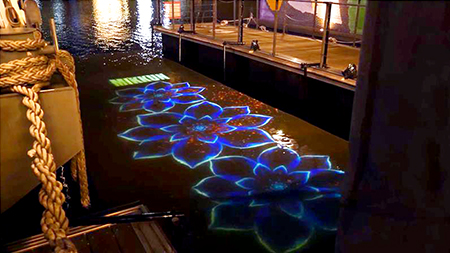また水面への投映は、天王洲という水辺の空間を活かした演出を目指し、様々な検討を重ね、3万ルーメンのプロジェクターとメッシュスクリーンを利用しました。本来、水面へプロジェクターから映像を投映しても、光が拡散し反射しづらい為、キレイに投映することが出来ません。なので今回は、メッシュスクリーンを水中に設置することで光を反射させ、さらにパナソニックの高輝度プロジェクターでの投映によって、水面の揺らめきを感じられる水面投映を実現しました。